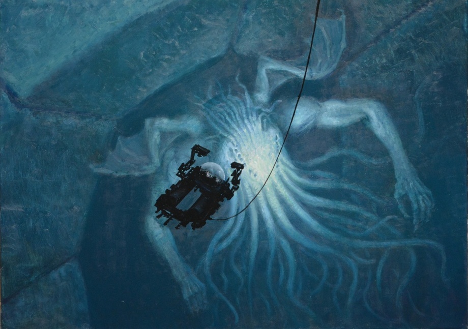 “There lay Great Cthulhu and his hordes, hidden in green slimy vaults and sending out at last, after cycles incalculable, the thoughts that spread fear into dreams of the sensitive and called imperiously to the faithful to come on a pilgrimage of liberation and restoration. All this Johansen did not suspect, but God knows he soon saw enough!”