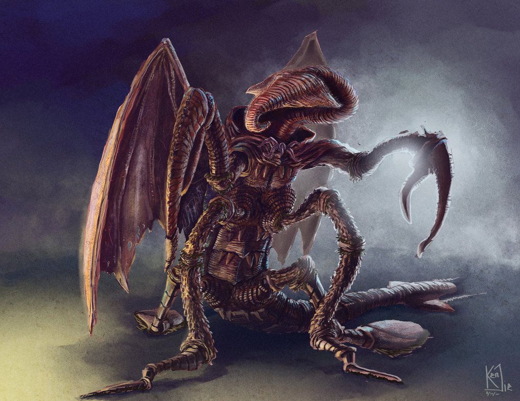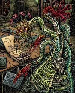 Stephen takes a break from his reading and tries to digest everything, but when he gets to the house and walks in front of the window the waning light hits it just right and he sees the Cthulhu head again. He climbs up to the window to get a better look , “But, to my unutterable horror, I looked instead upon a landscape completely alien to me, completely foreign to anything within my experience.” with “amorphous beings which came rapidly towards me with manifestly evil intent, grotesque octopoid representations, and aweful things that flew on great black rubbery wings and dragged repellant claw-like feet.”