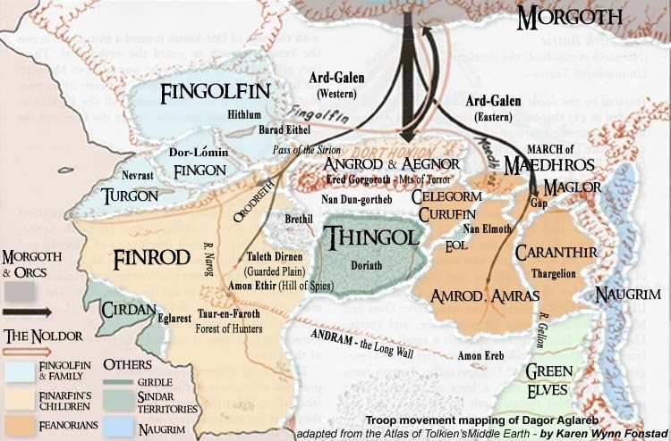 So Maedhros turned to the Naugrim (Dwarves) and Men. Fingon in Hithlum to the east, “ever the friend of Maedhros,” also came to aid. Maedhros looked upon his army and “made trial of his strength too soon” and “resolved to assault Angband from east and west.” He would attack from the east and draw out Morgoth’s armies, while Fingon and the Men would pincer from the West.