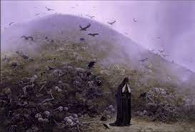 “By the command of Morgoth the Orcs with great labour gathered all the bodies of those who had fallen in the great battle, and all their harness and weapons, and piled them in a great mound in the midst of Anfauglilth; and it was like a hill that could be seen from afar. Haudh-en-Ndengin the Elves named it, the Hill of Slain, and Haudh-en-Nirnaeth, the Hill of Tears. But grass came there and grew again long and green upon that hill, alone in all the desert that Morgoth made; and no creature of Morgoth trod thereafter upon the earth beneath which the swords of the Eldar and the Edain crumbled to rust.“