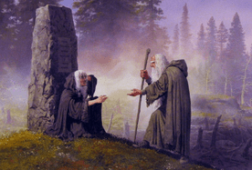The despair of Húrin deepens and he stumbles around until he finally comes upon a large stone, “But Húrin did not look at the stone, for he knew what was written there.” Namely the memorial for his children. Sitting at the stone, he finds Morwen, spent and ready to pass away. She doesn’t seem surprised to see him, almost as if he were a shade coming to her in the twilight. They speak for a moment and watch the sunset together, holding hands as she passes away.