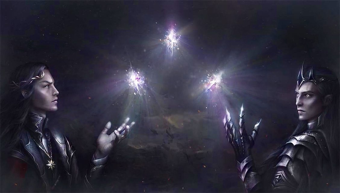 Don’t see what I’m saying? Well, he tells Elrond that without Mithril, the Elves will perish. That Mithril is actually from some fantastic story of an unnamed Elf fighting a Balrog on the Misty Mountains, and somehow the light of the Silmaril gets infused into Mithril. The Silmarils are a creation of Fëanor, a fiery Noldor elf who created them from the light of the trees of Valinor (they were the only light in the world before the Sun and the Moon were made). The Silmarils were what caused ALL the great wars in the First Age.
