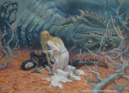 So how could Turambar’s life degrade from killing the drake, you might ask? Well, he passes out next to the Foalókë, and when Níniel comes to find him, she thinks he died along with the dragon in mortal combat. She weeps next to Turambar. She weeps for her husband. She cries for the man who killed the dragon and saved their people. But her weeping wakes Glorund for one last gasp.