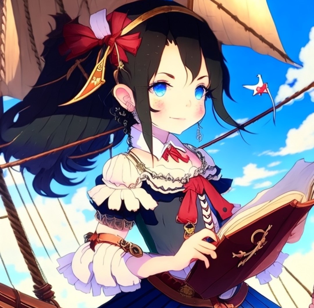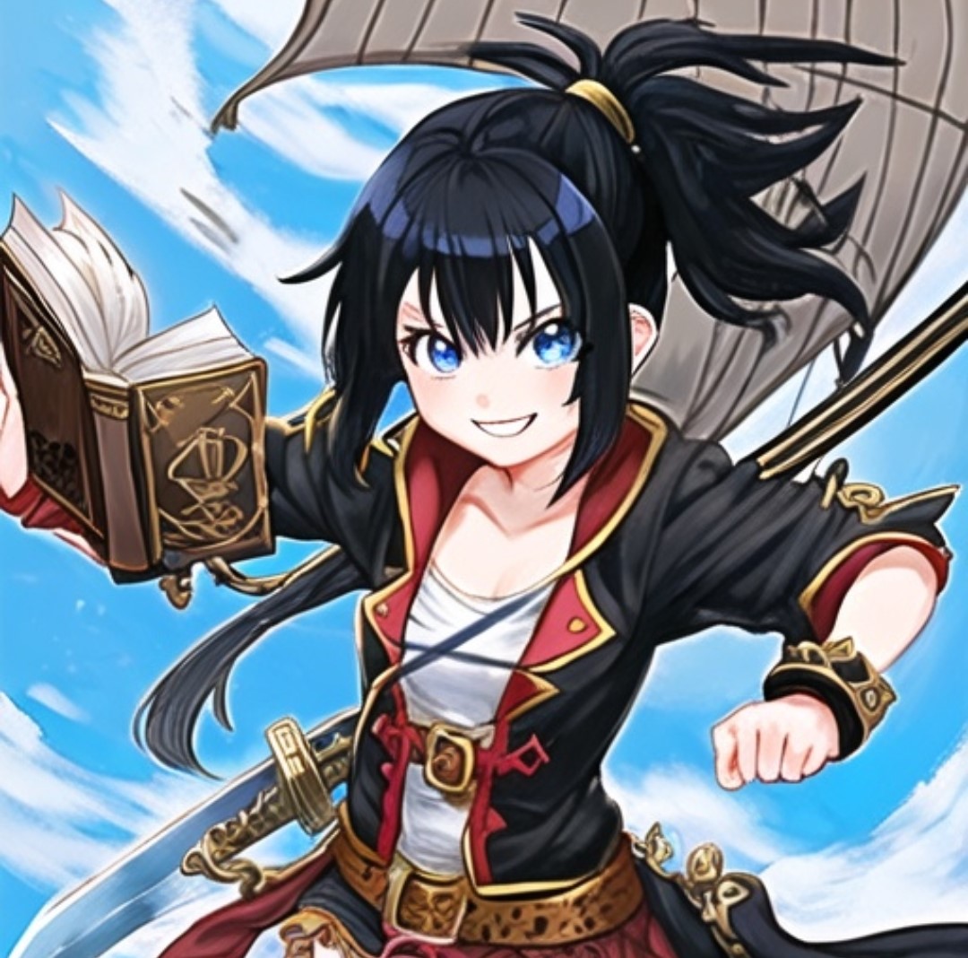 Excited, she flipped the cover open and saw an intricate drawing of a giant Pirate ship and a pirate with a pegleg and a large hat who held a sword in his hand.