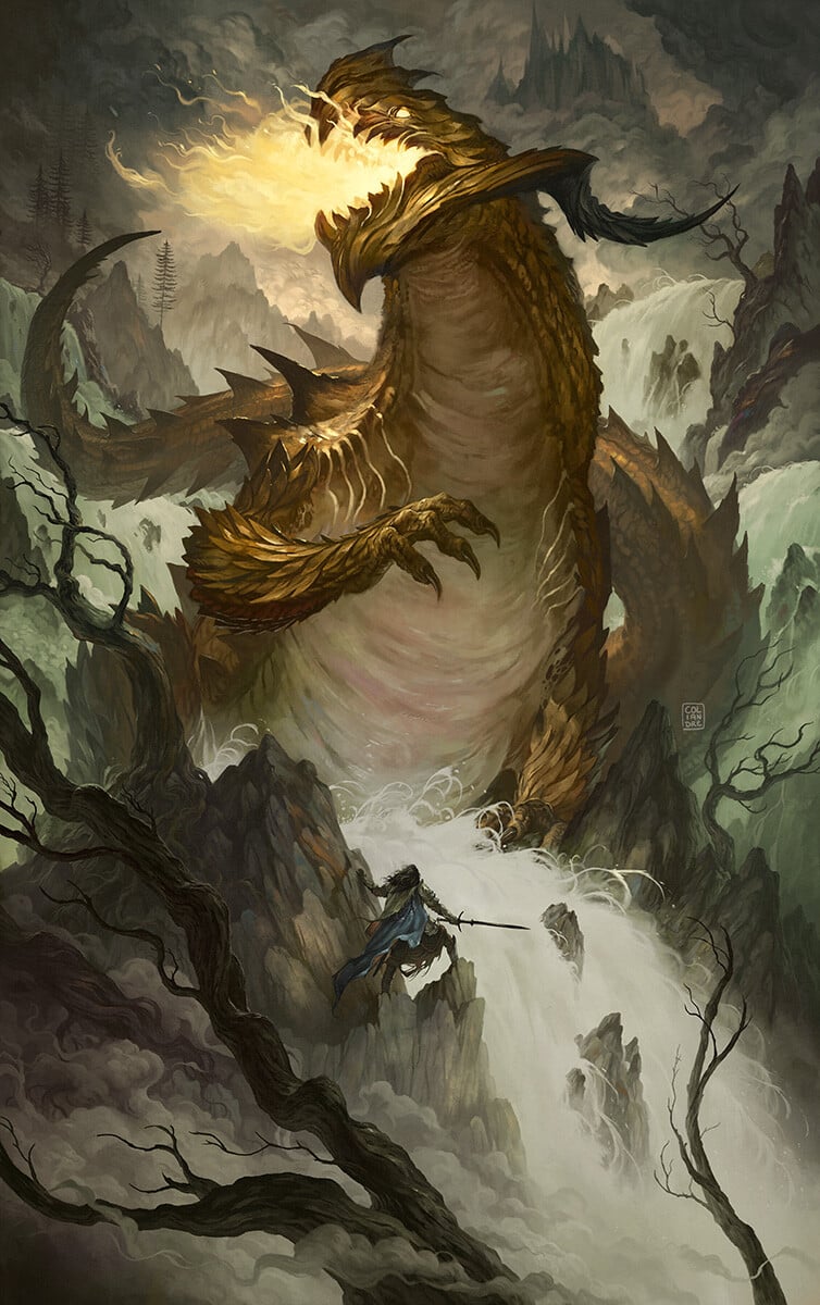 Orodreth tried to speak against fighting against Melko’s armies, regretting his creation of the Wand of Death, but Túrin was both craving war and trying to atone for his past indiscretions, so he went out and fought every agent of Melko he could find. He became infamous, and it did not go past Melko’s sight. Melko released a great army, “and a great worm was with them whose scales were polished bronze and whose breath was a mingled fire and smoke, and his name was Glorund (pg 84).”