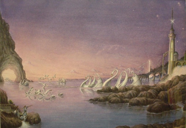 Remember that the Solosimpi were in the later versions of the Teleri Elves, so this is the first iteration of the Lothlórien “Swan Shaped Barge,” which we also briefly glimpse Galadriel on in The Lord of the Rings.