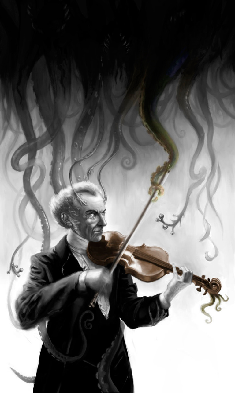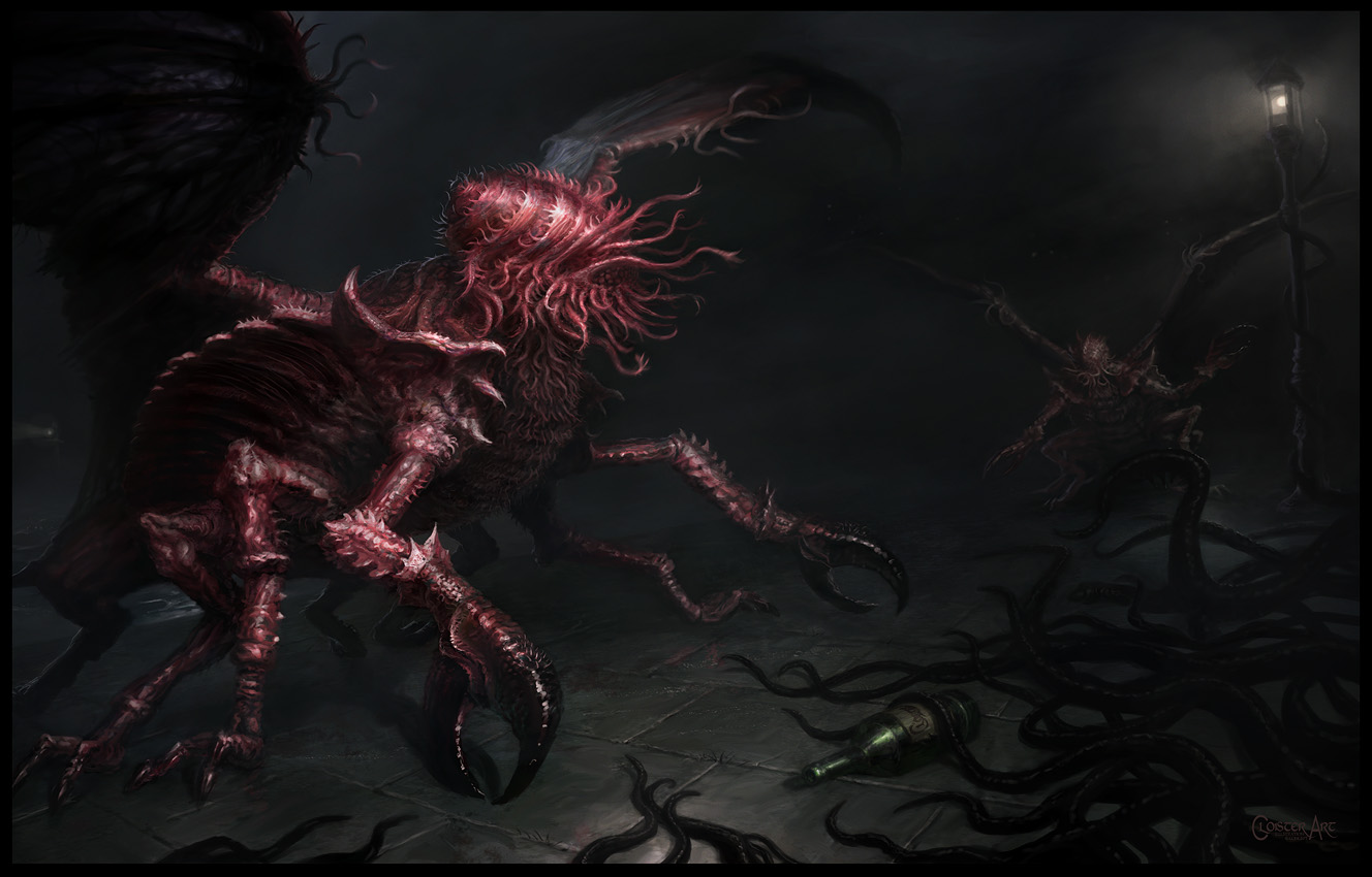 “…the Thing, which first appeared before me as an angular extension into space, with its focal point before my cousin Ambrose at the tower, became in succession a great amorphous mass of changing flesh, squamous as certain snakes, and putting forth and drawing back constantly and without cessation innumerable tentacular appendages of all lengths and shapes; a horrible, blackly furred thing with great red eyes that opened from all portions of its body; a hellish monstrosity which was octopoid in seeming to have become a small, shrivelled mass of torso with tentacles hundreds of times its size and weight which whipped backward in a fanning motion into space, and the ends of which were literally sloughed or melted away into distance, while the empurpled body opened a great eye to look upon my cousin, and disclosed beneath it a great pit of mouth from which issued a terrible, if muted, screaming...”