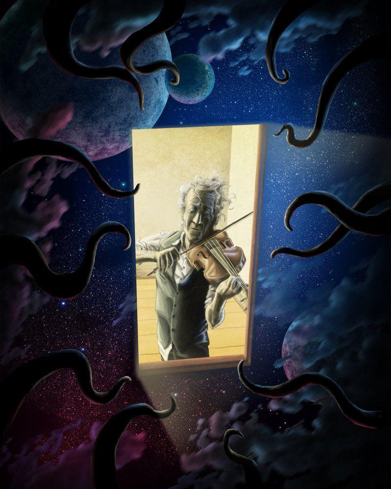 A gust comes in through the window and Zann plays furiously, his eyes wide and terrified. The narrator looks to the window where he “might see the slope beyond the wall, and the city outspread beneath… but only blackness of space illimitable; unimagined space alive with motion and music, and having no semblance to anything on earth.”